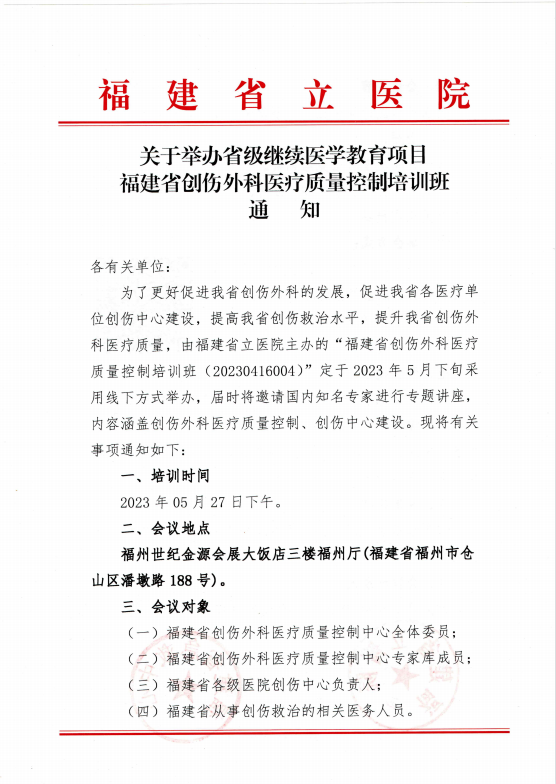 【学术交流】关于举办省级继续医学教育项目福建省创伤外科医疗质量控制培训班的通知